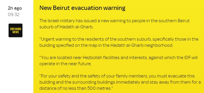 天空新闻(Sky News)指出,以色列军方向贝鲁特南部郊区哈达特·加尔布的居民发出了新的警告。“向南郊居民发出紧急警告,特别是地图上Hadath al-Gharb街区所指建筑内的居民。你们位于真主党的设施和利益附近,以色列国防军将在不久的将来对其采取行动。为了您和家人的安全,您必须立即撤离这栋建筑和周围的建筑物,并远离它们至少500米的距离。”