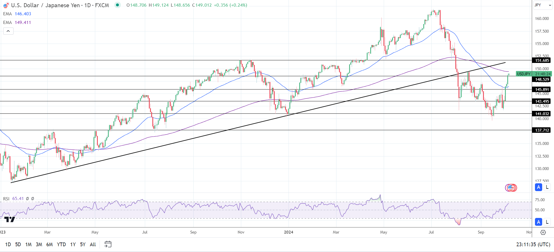 14天RSI为65.41,表明美元/日元将攀升至200天EMA,然后进入超买区域。
