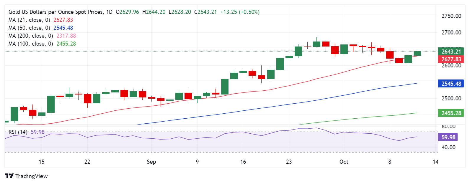 周五(10月11日)亚市盘中,现货黄金短线显著走高,一度2645美元/盎司,日内大涨逾15美元。FXStreet高级分析师Dhwani Mehta周五撰文,对金价技术走势进行分析。