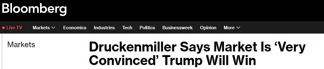 德鲁肯米勒周三(10月16日)在接受电视采访时表示,在过去的12天里,市场似乎“非常确信特朗普会赢”。